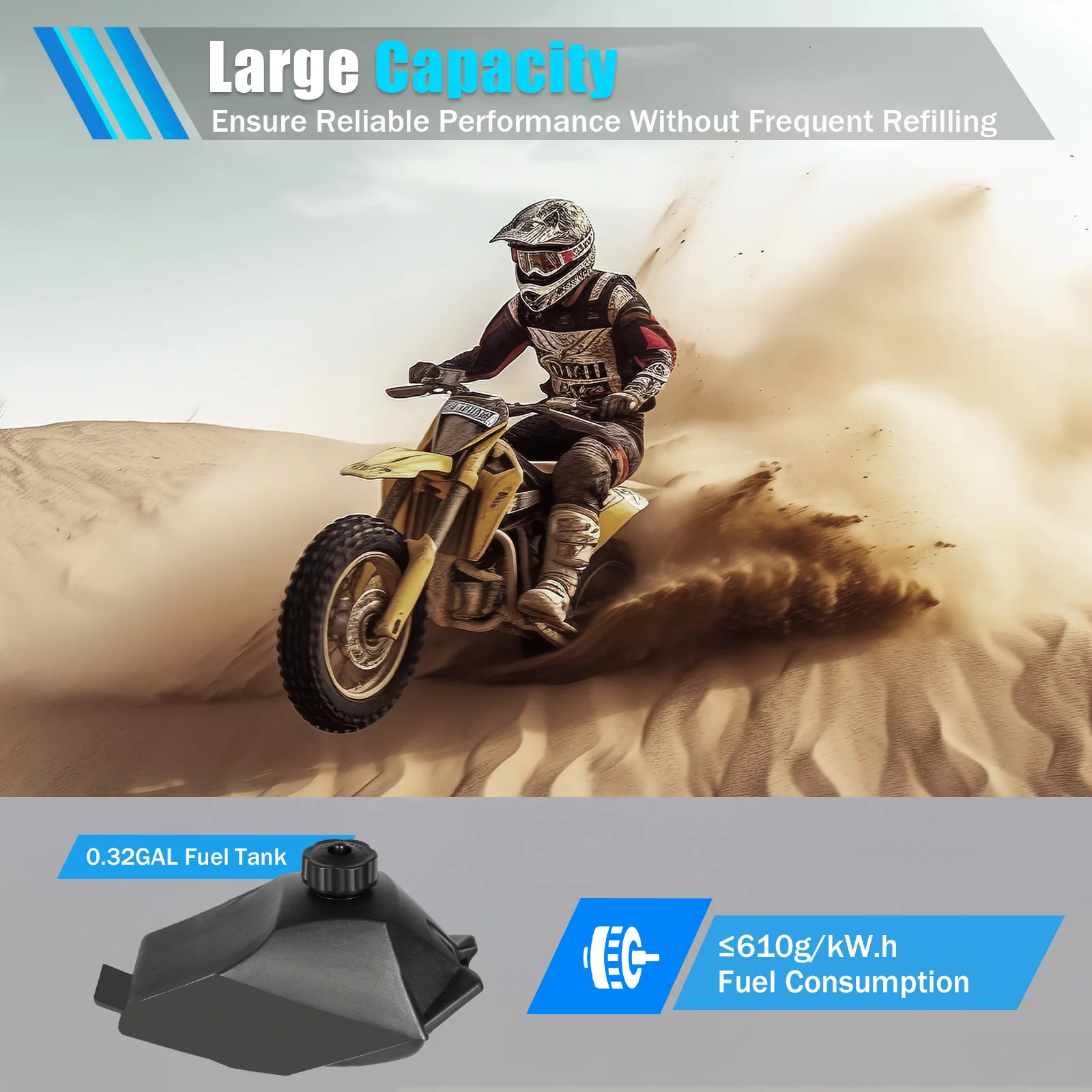 Large Fuel Tank: It is equipped with a 0.32gal fuel tank, which can last for a longer distance after filling up with gas and fuel, supporting long-distance riding and making it more convenient for outdoor use.