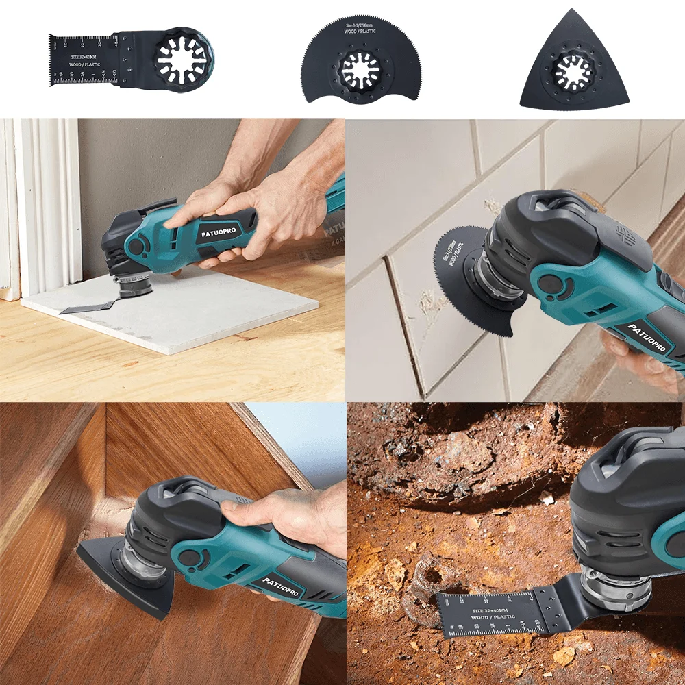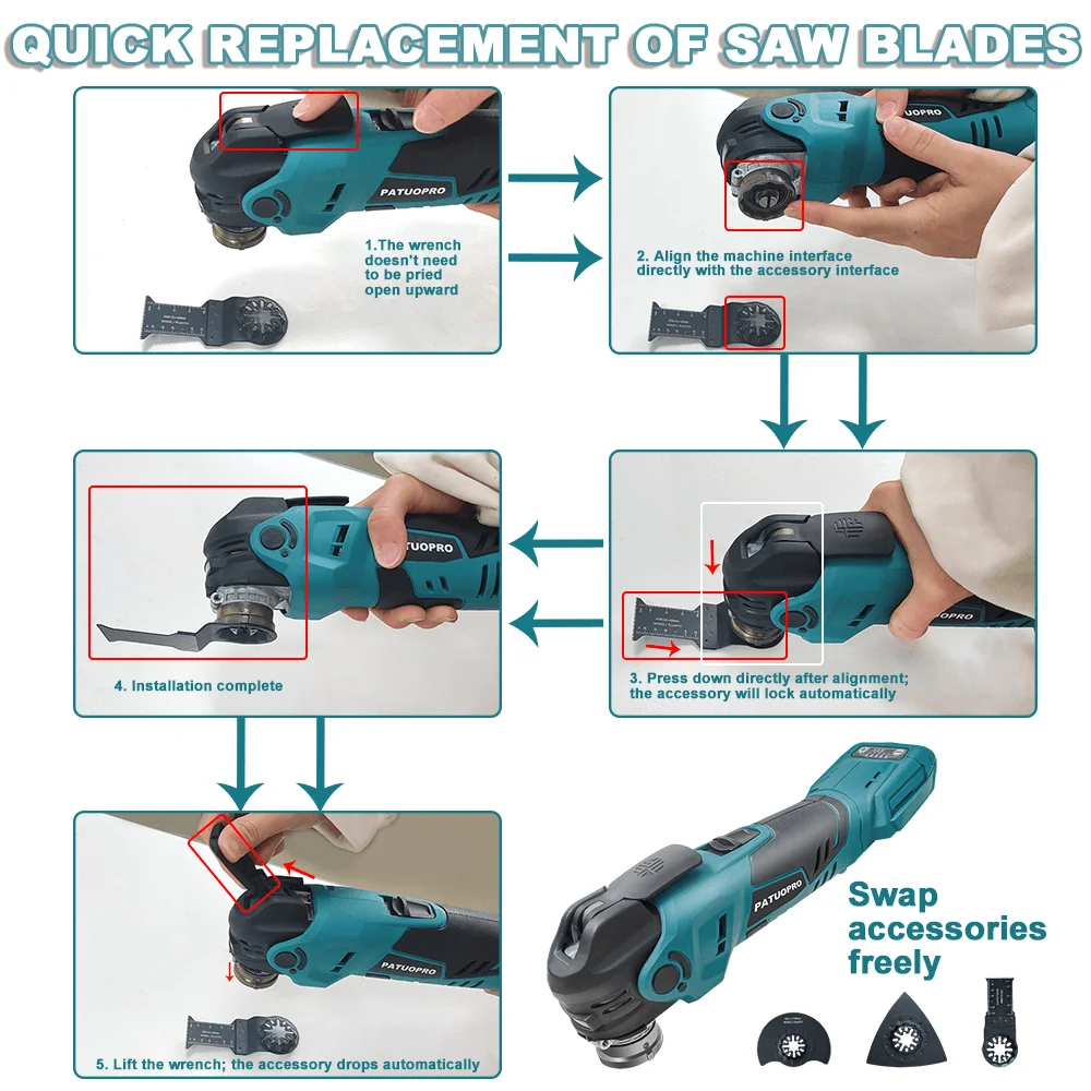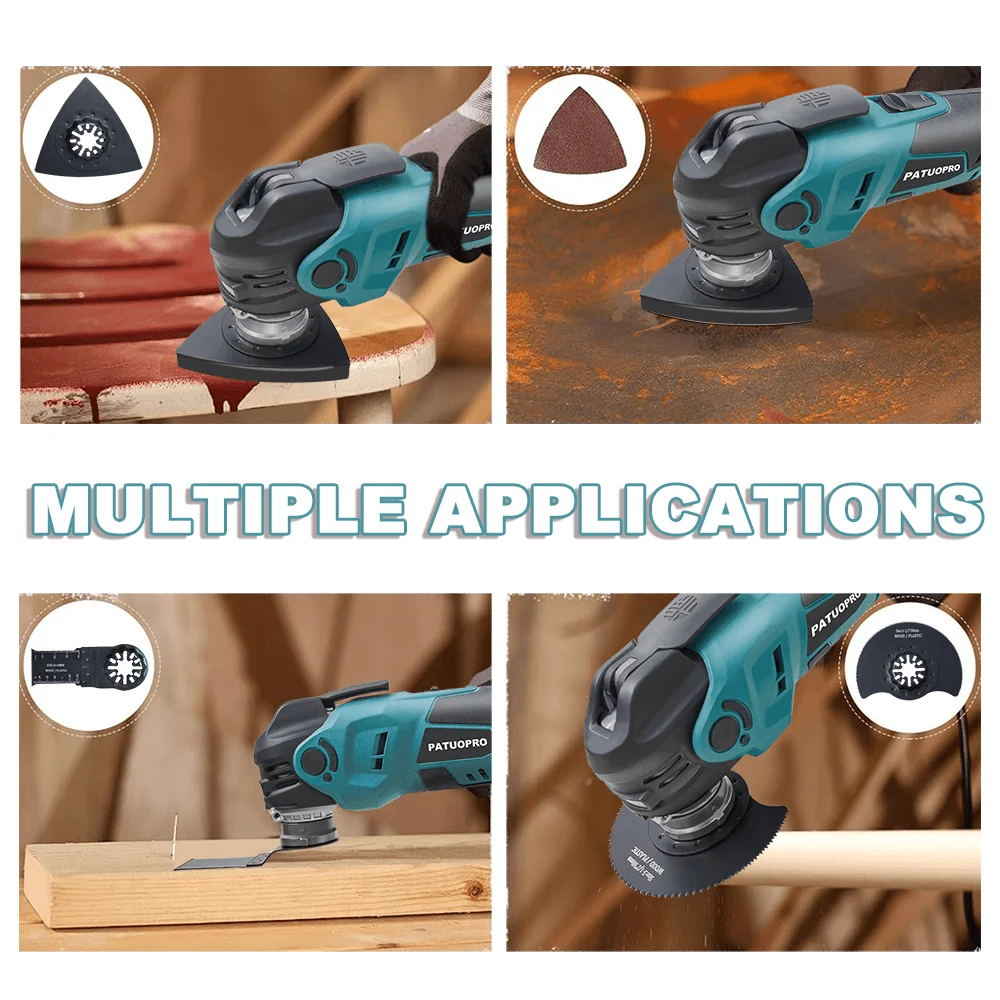 – Quick Blade Change System:Equipped with a quick-change system that allows for tool-free blade and accessory swaps in seconds, improving work efficiency. The product comes with a 6-piece multi-functional accessory kit, including saw blades, sandpaper and more, meeting the cutting, sanding, and scraping needs for various materials (such as wood, metal, plastic, etc.)