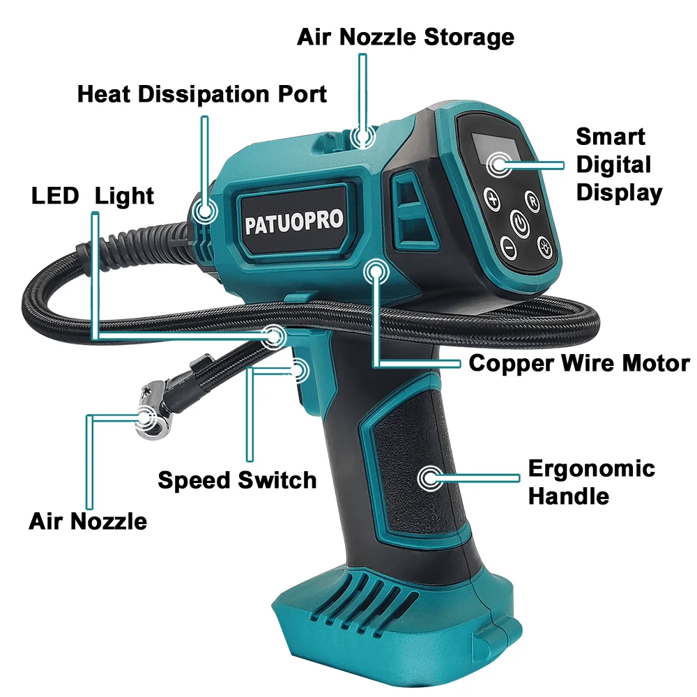 -【Portable and ergonomically designed】 The bare metal weight of the electric air pump is only 1160g. It is compact and portable and can be carried with you at any time. It has a comfortable-feeling body made of non-slip soft rubber. Its ergonomic design enhances your use experience and will not cause fatigue when held -【Wide range of uses】 The electric air pump is suitable for cars, motorcycles, bicycles, sports balls and inflatable pool toys, etc. Note: Not suitable for large truck tires.