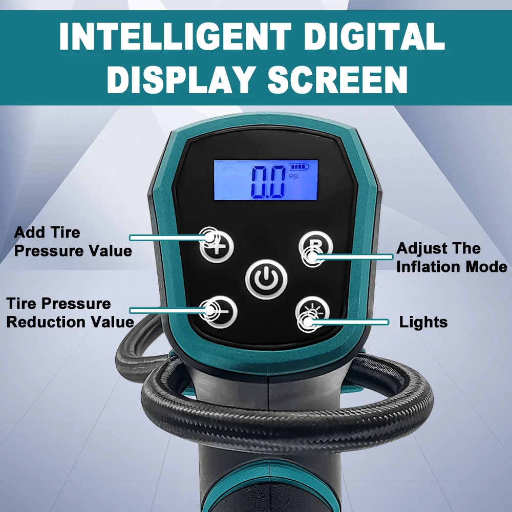 -【Intelligent digital display】 The intelligent digital display shows real-time pressure and preset values. The air pump has 3 optional units: PSI, BAR, and KPA. Press the "+" and "-" buttons to preset the desired pressure level. The electric air pump will automatically shut off at the desired level, no need to worry about over-inflation.